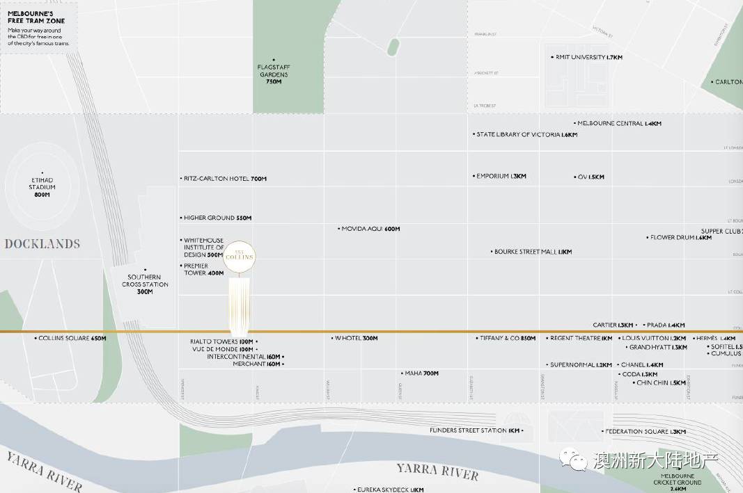 项目位于Collins Street和King Street交界处,这里不单便捷,而且更是精英和精致的象征,Collins Street被评为墨尔本第一街,是著名的金融街和奢侈品街,除了其他市区街道的优点以外,这里还是被历史沉淀、被艺术熏陶的古老街道!