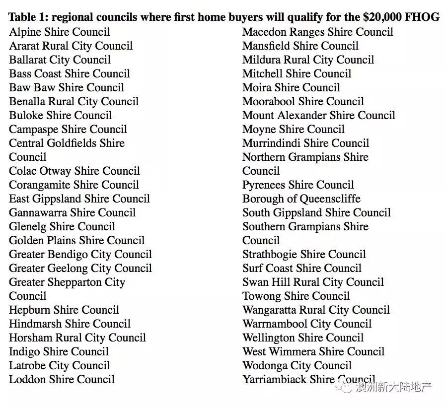 关于2万的首次置业补贴,仅限于维州乡村地区,墨尔本地区是1万澳币补贴。以下是SRO罗列的乡村地区一览,小伙伴可以作为参考: